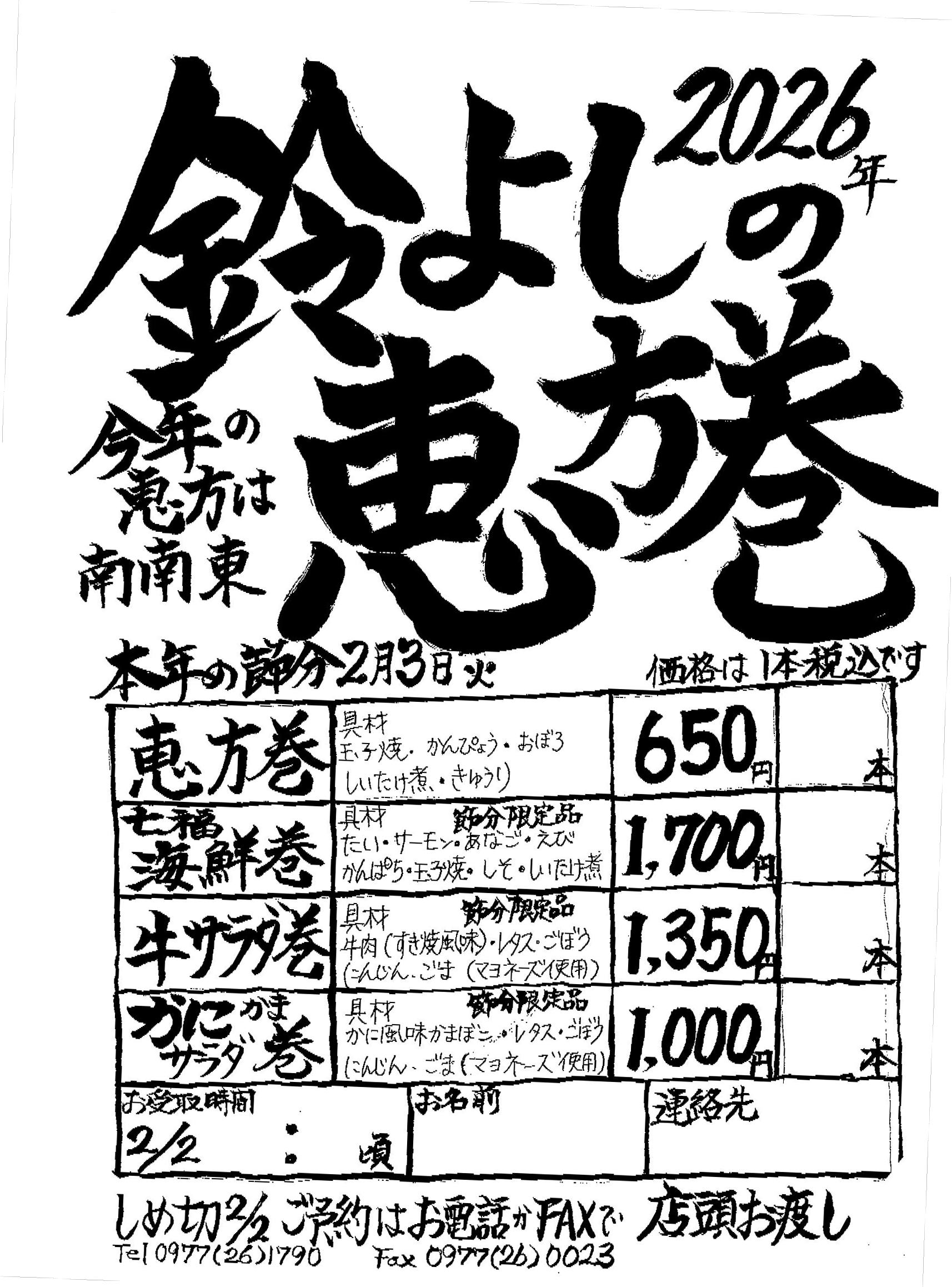 表示価格はお持ち帰り価格税込となっております。 | 福やご縁を巻き込み、1年の幸せや願いが叶うようにぜひ恵方巻をお食べ下さい。 2026年の恵方巻を食べる方角は、「南南東(正確には南南東やや南)」 ※受付締切は2/2(月)迄、2月3日(火)店頭にてお渡しいたします。 |